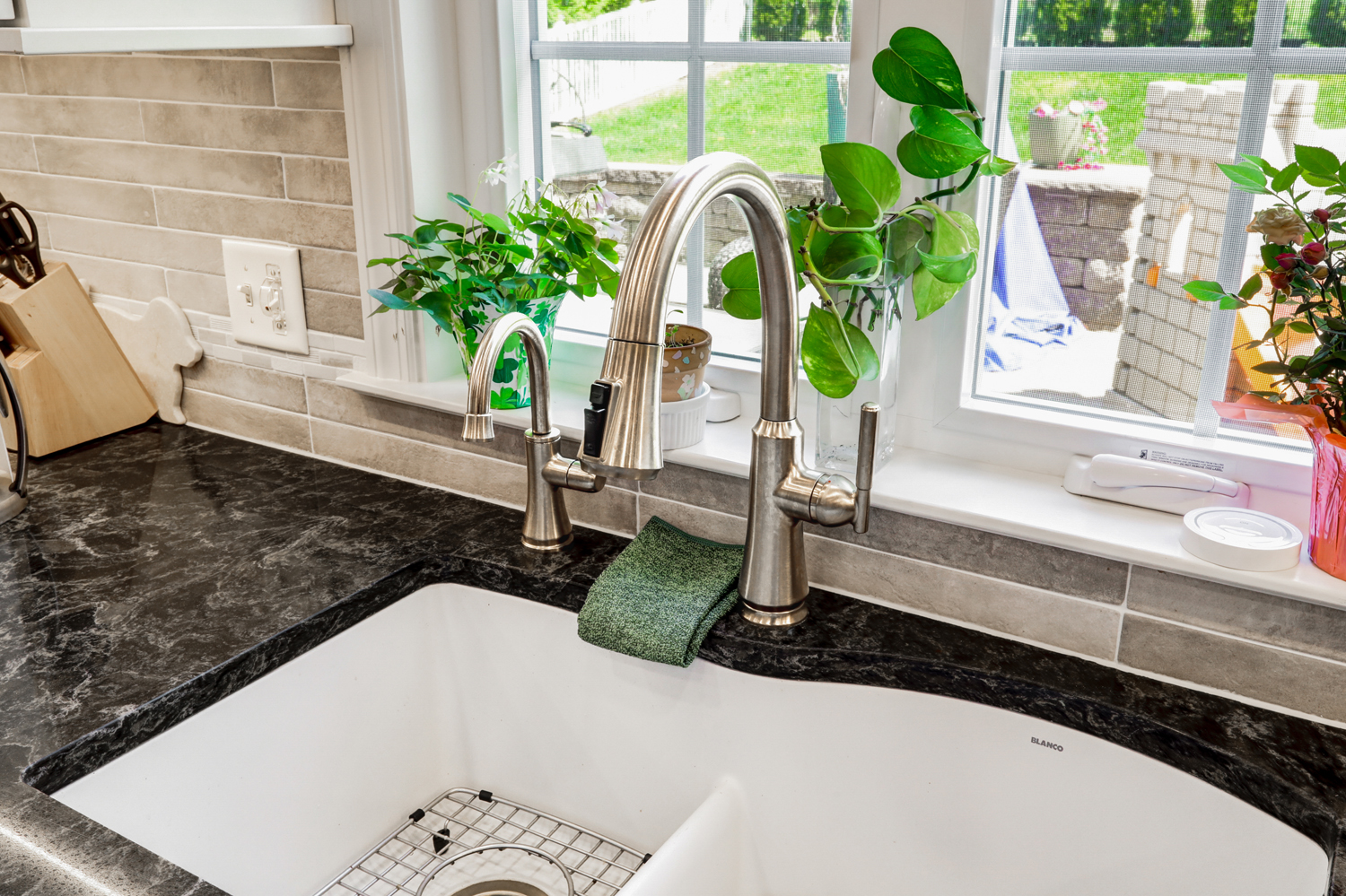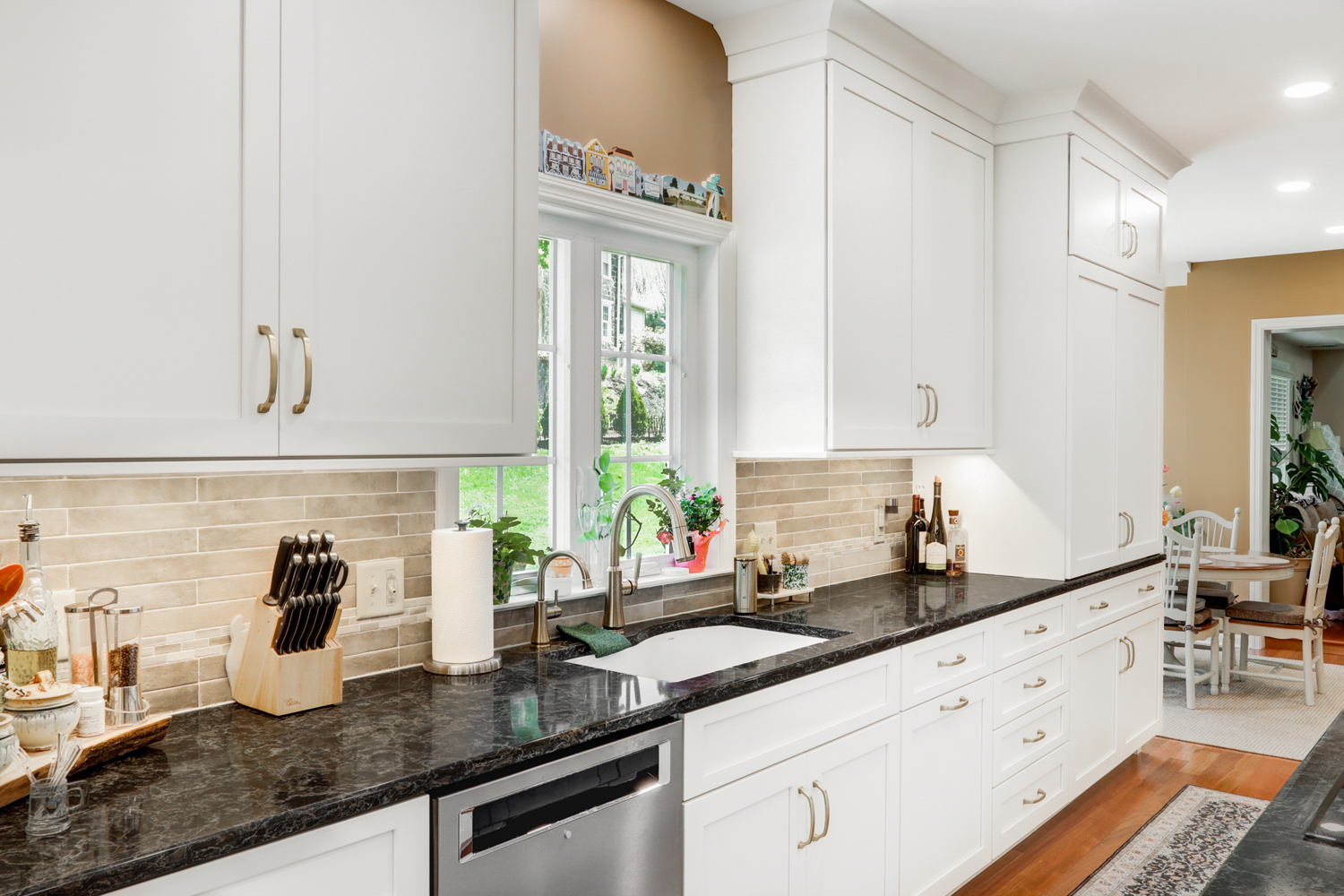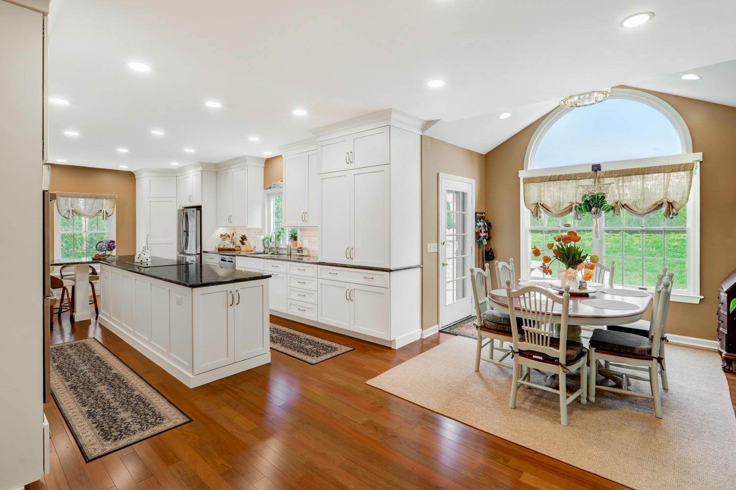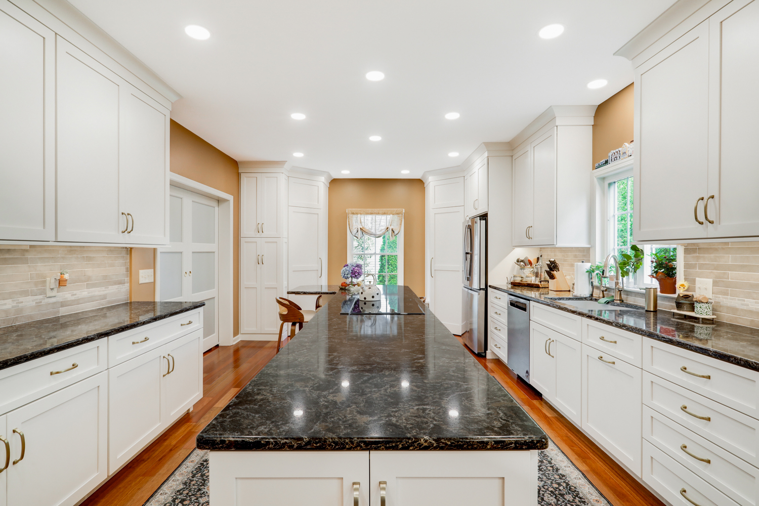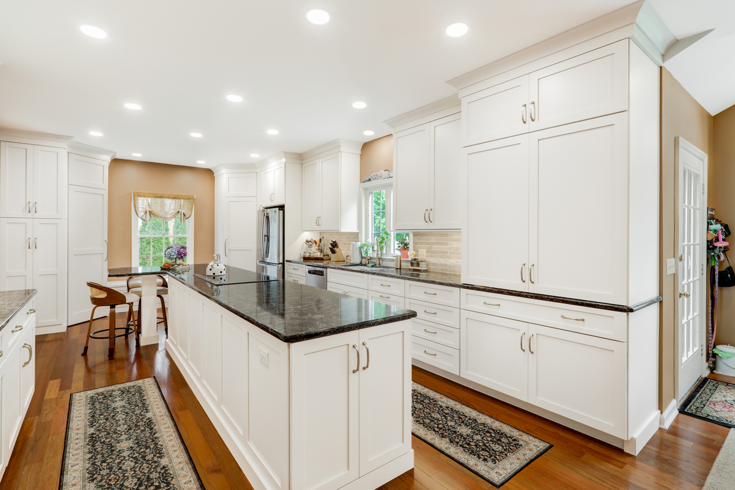One of the standout features in this kitchen is the ceiling’s evenly spaced recessed lighting, often referred to as waffle lights. This lighting design creates a bright, consistent glow across the entire kitchen, eliminating shadows and enhancing both the workspace and overall ambiance. Paired with natural light from the windows, the result is a welcoming and highly functional environment.