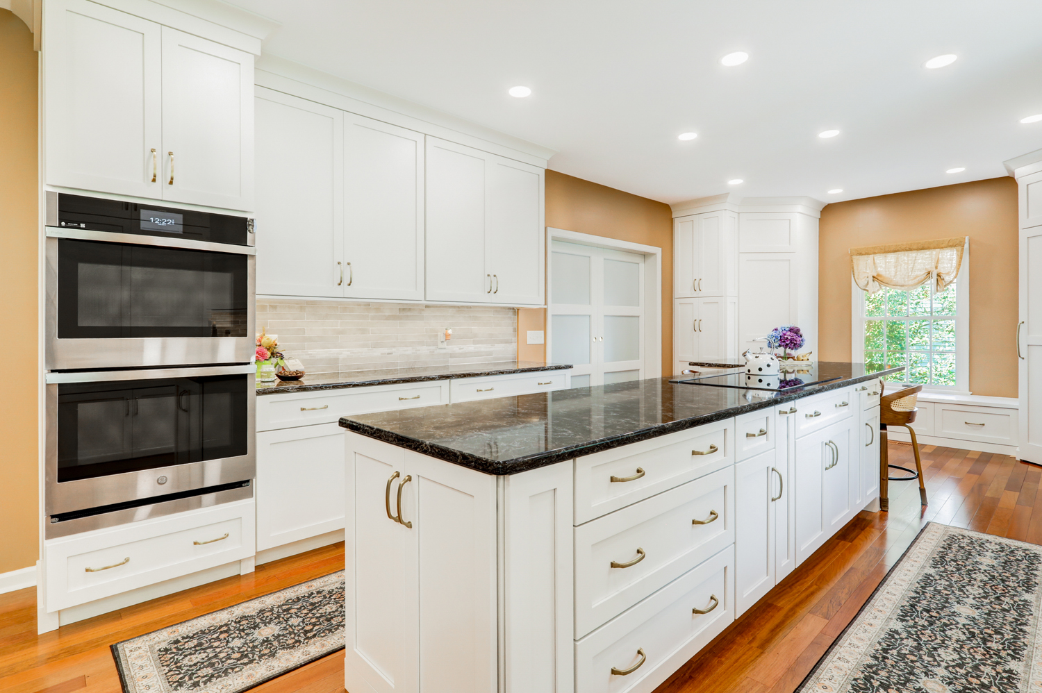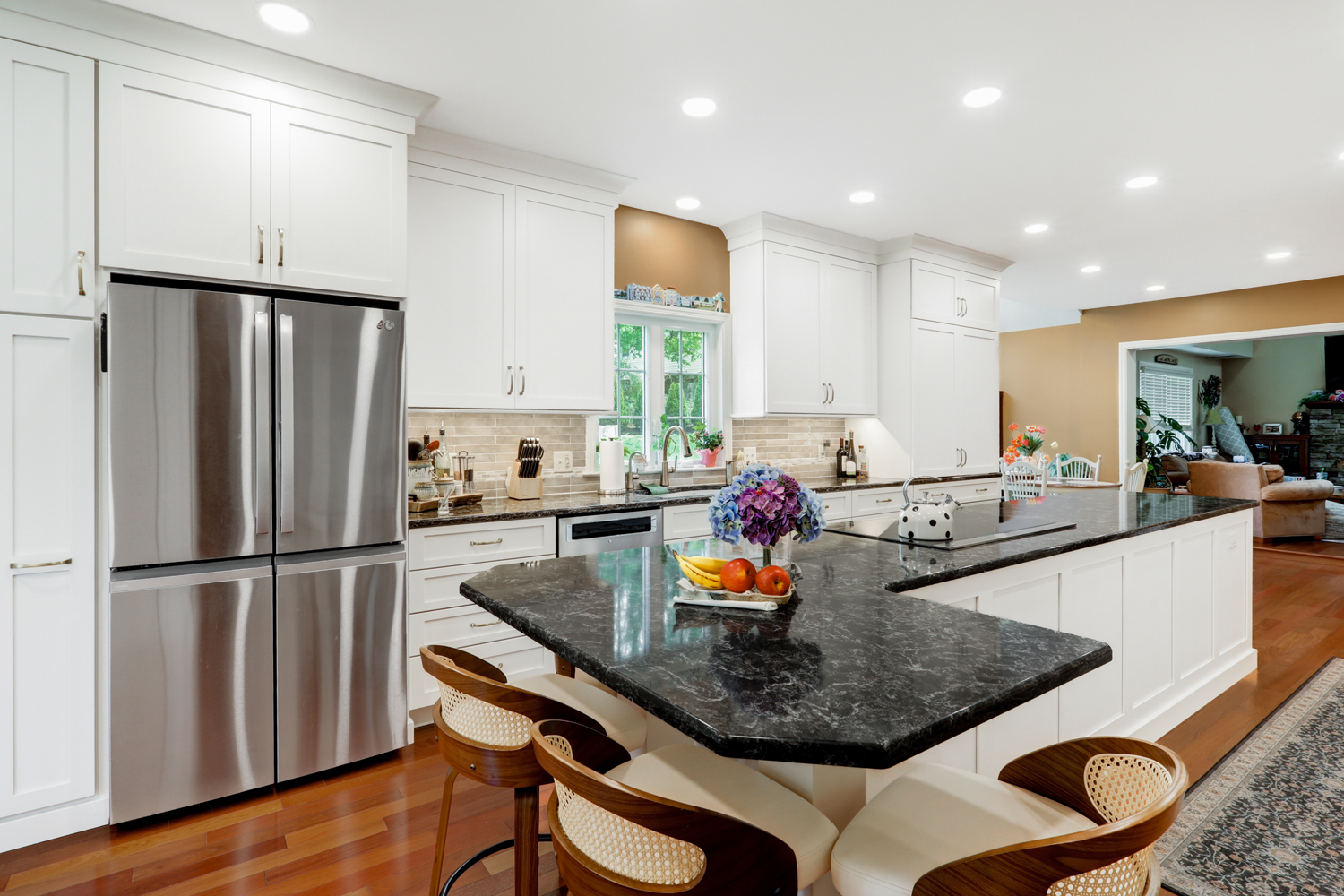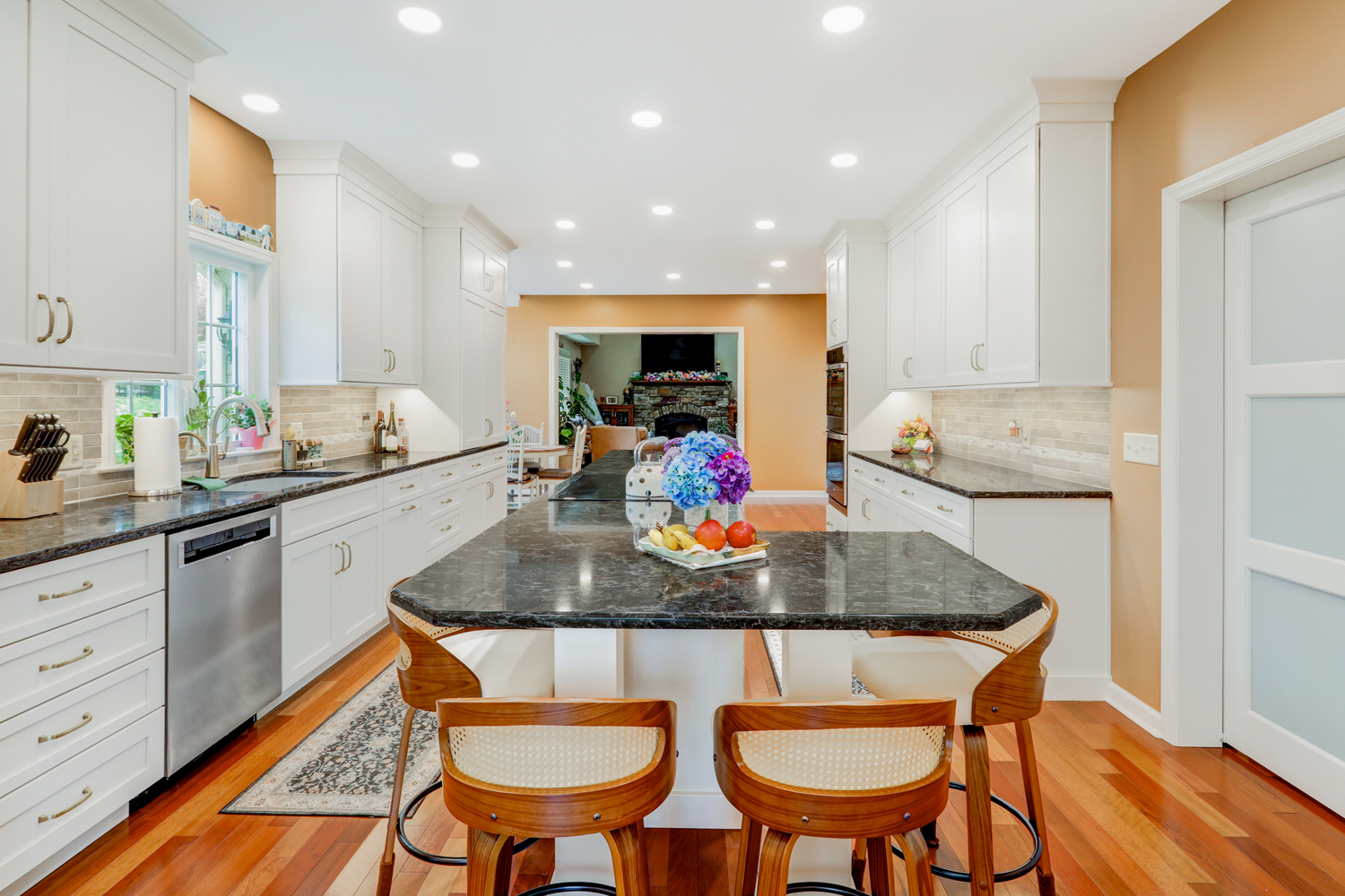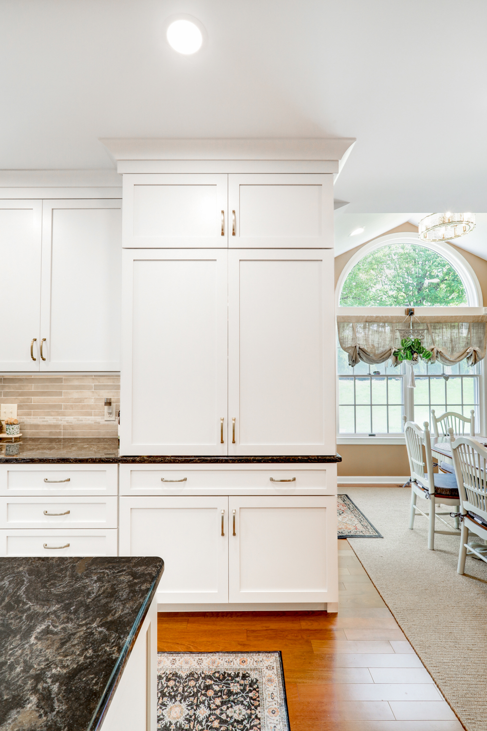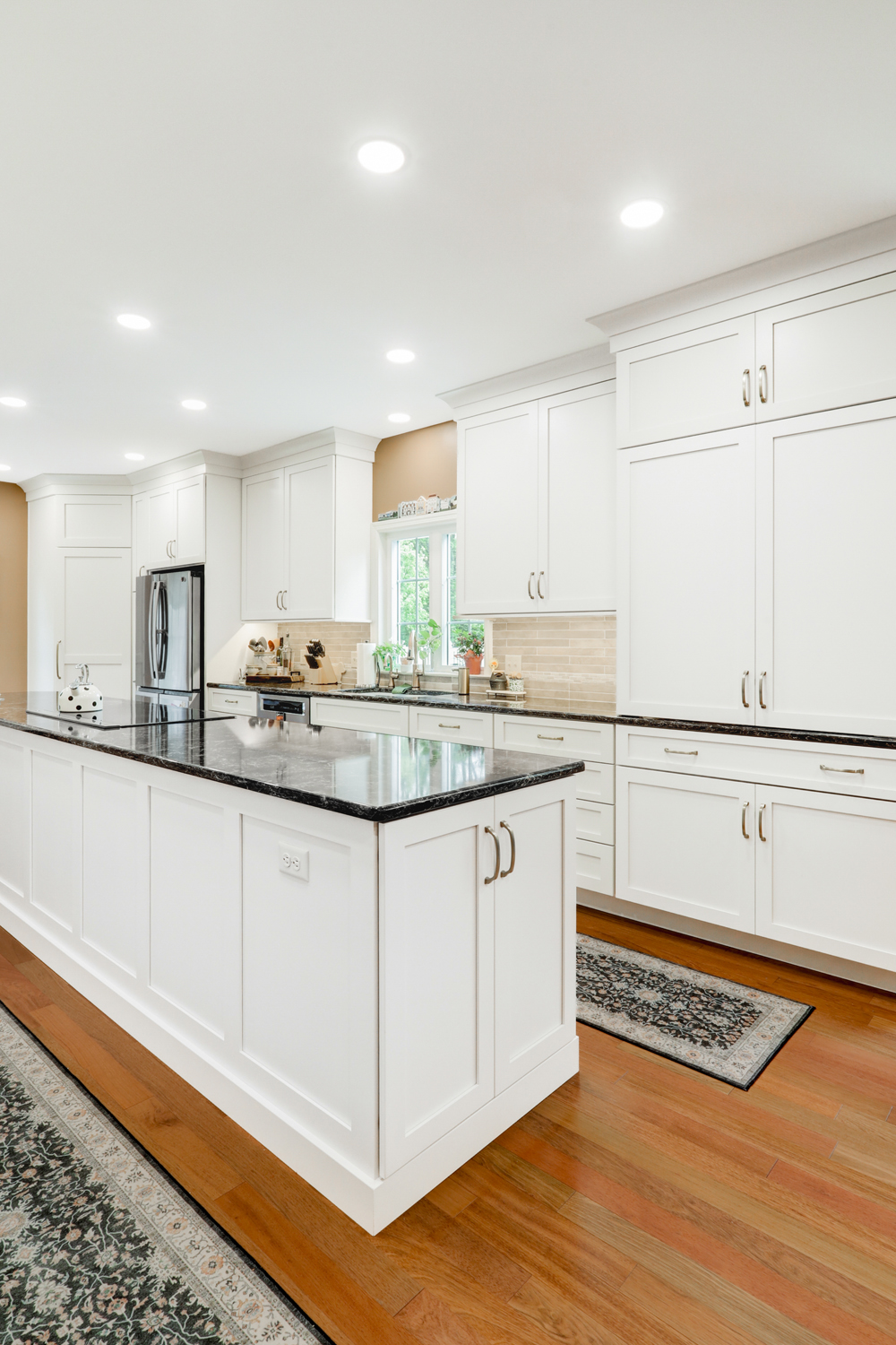 The oversized island offers ample workspace and seating, making it ideal for gathering with family or hosting guests. Topped with a rich, dark countertop, it provides contrast against the light cabinetry while delivering durability for daily use. Surrounding the island, the layout was carefully planned to maximize flow, storage, and function—key elements in any successful kitchen remodel.