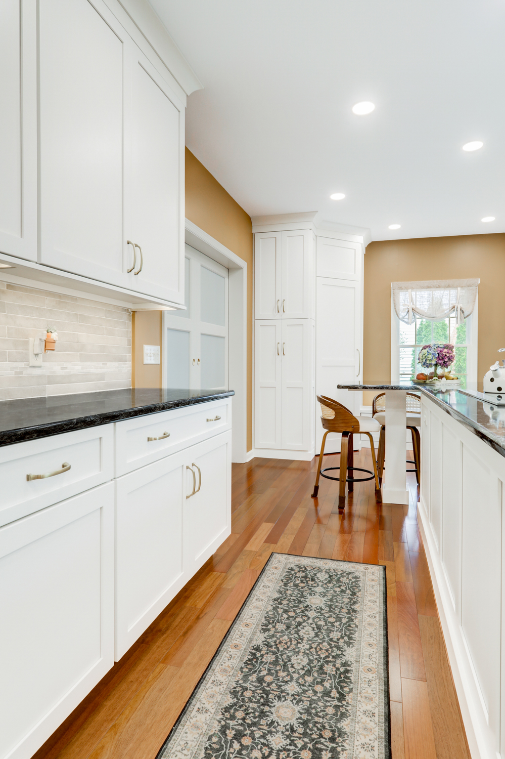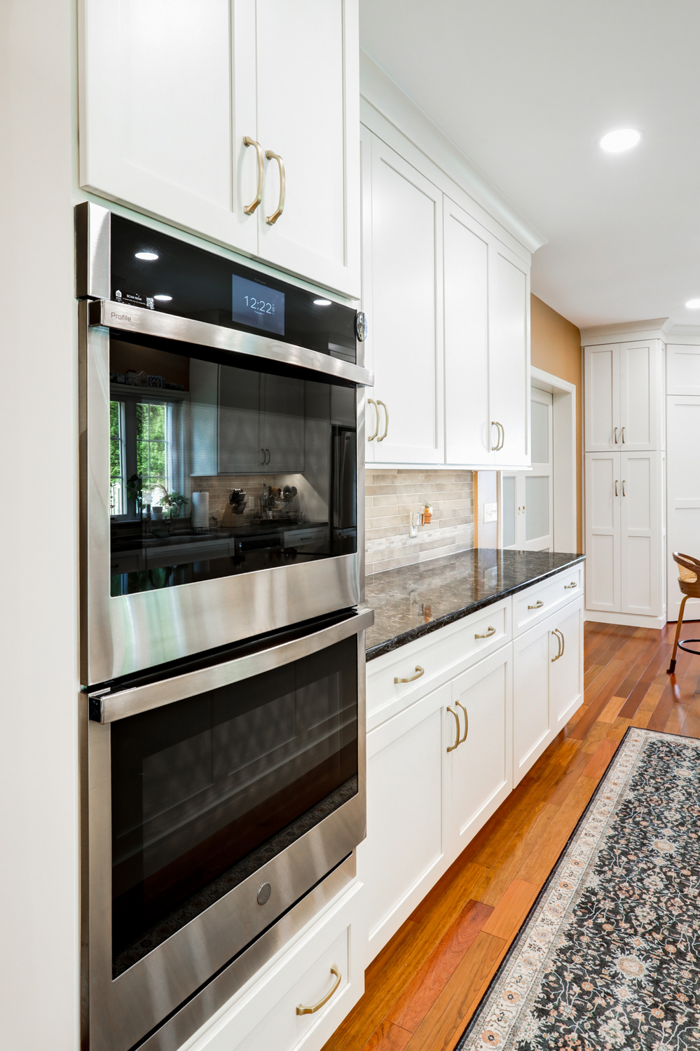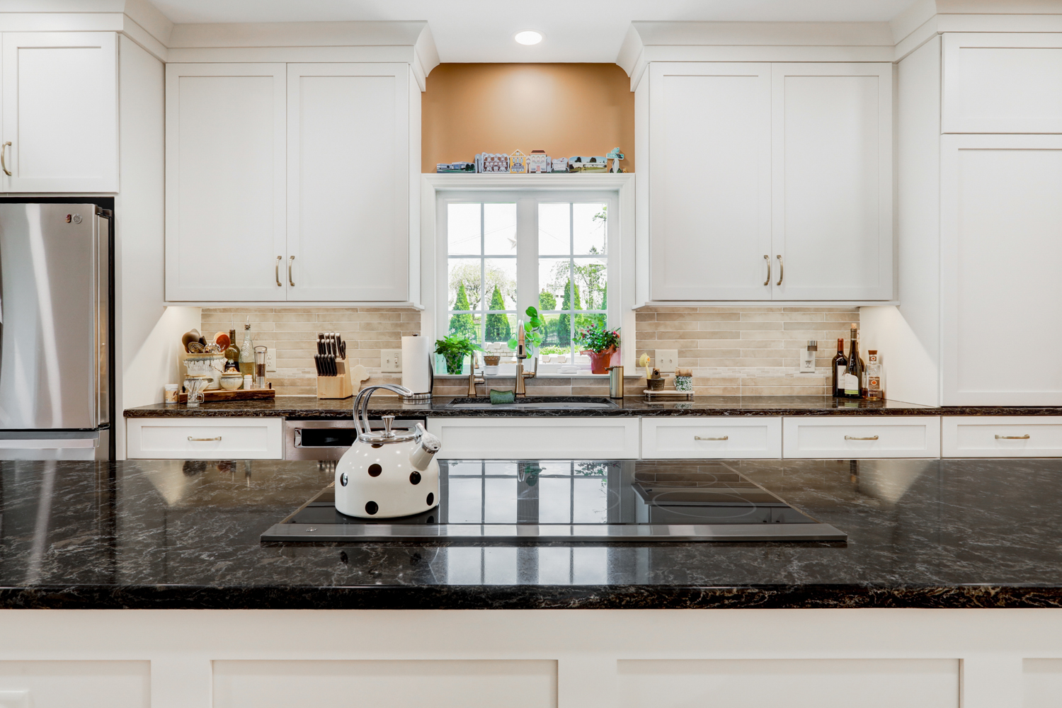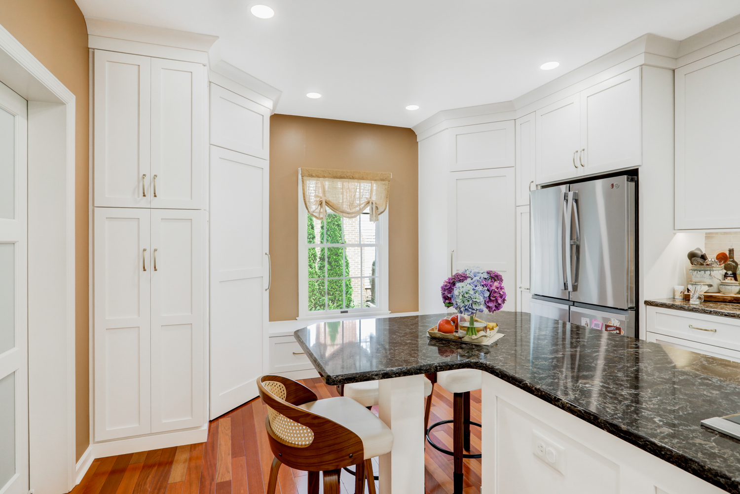 The oversized island offers ample workspace and seating, making it ideal for gathering with family or hosting guests. Topped with a rich, dark countertop, it provides contrast against the light cabinetry while delivering durability for daily use. Surrounding the island, the layout was carefully planned to maximize flow, storage, and function—key elements in any successful kitchen remodel.
