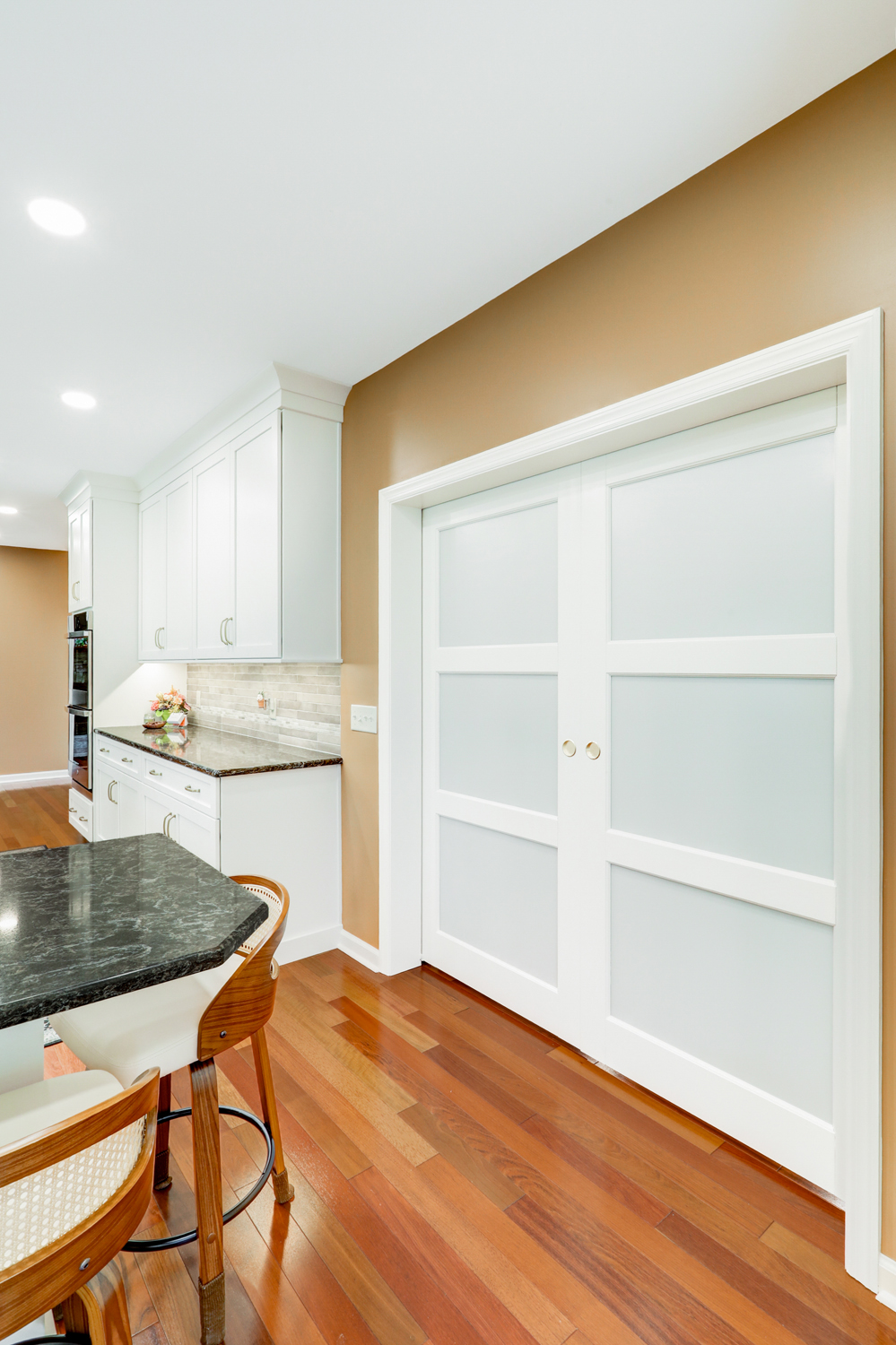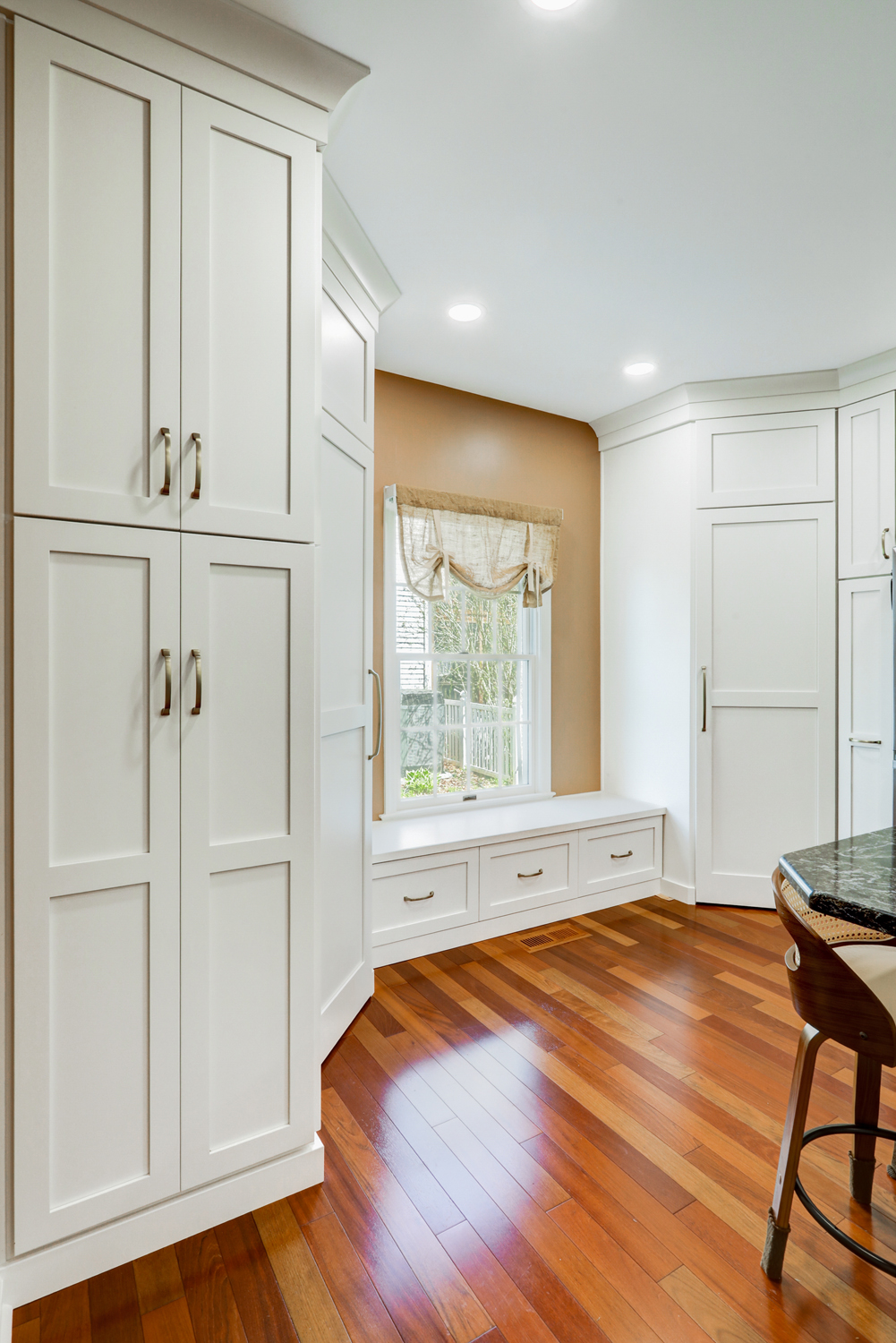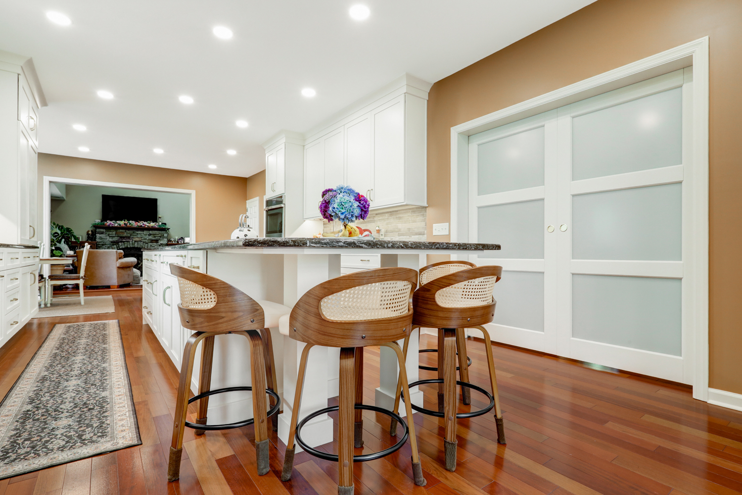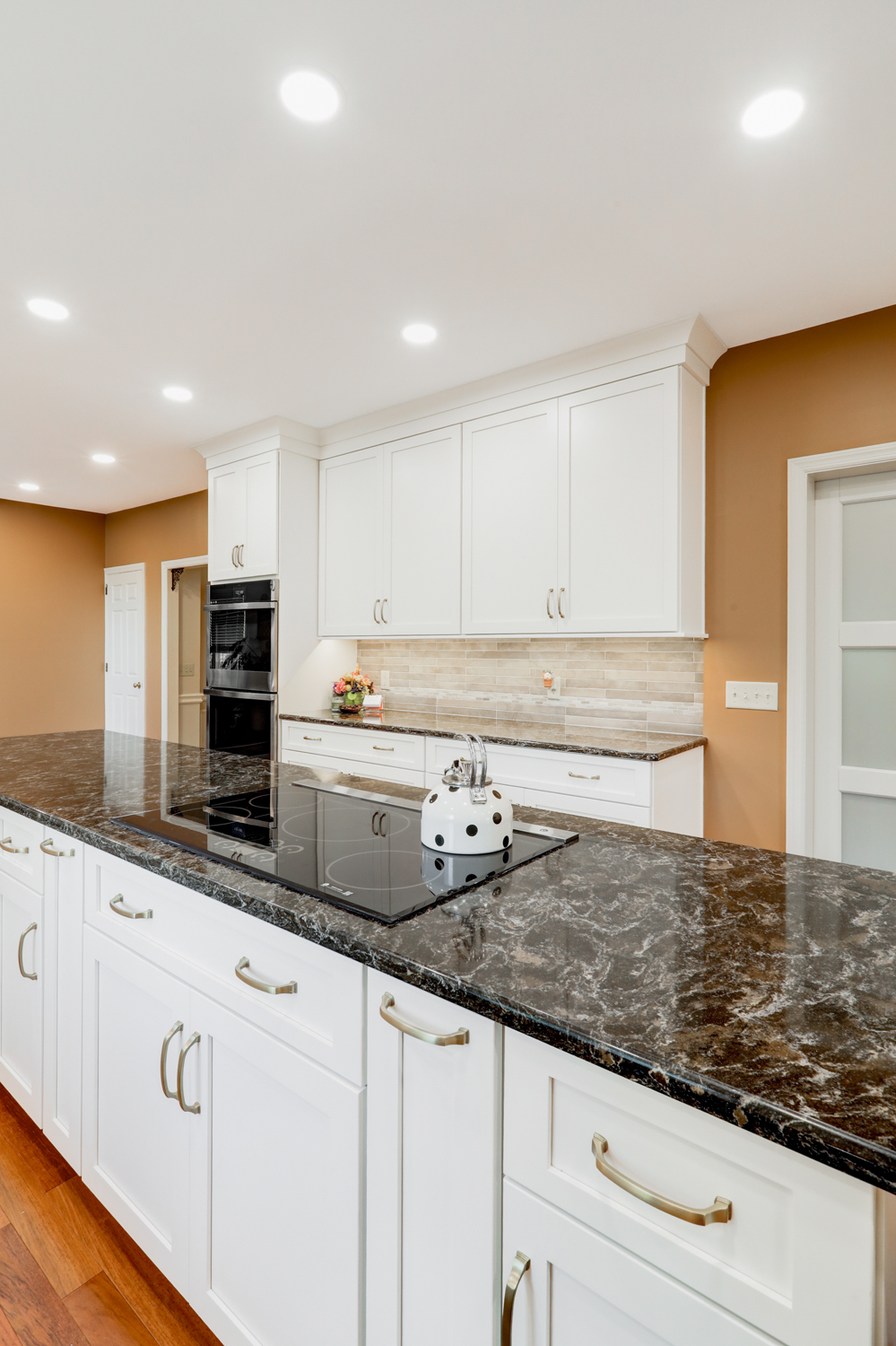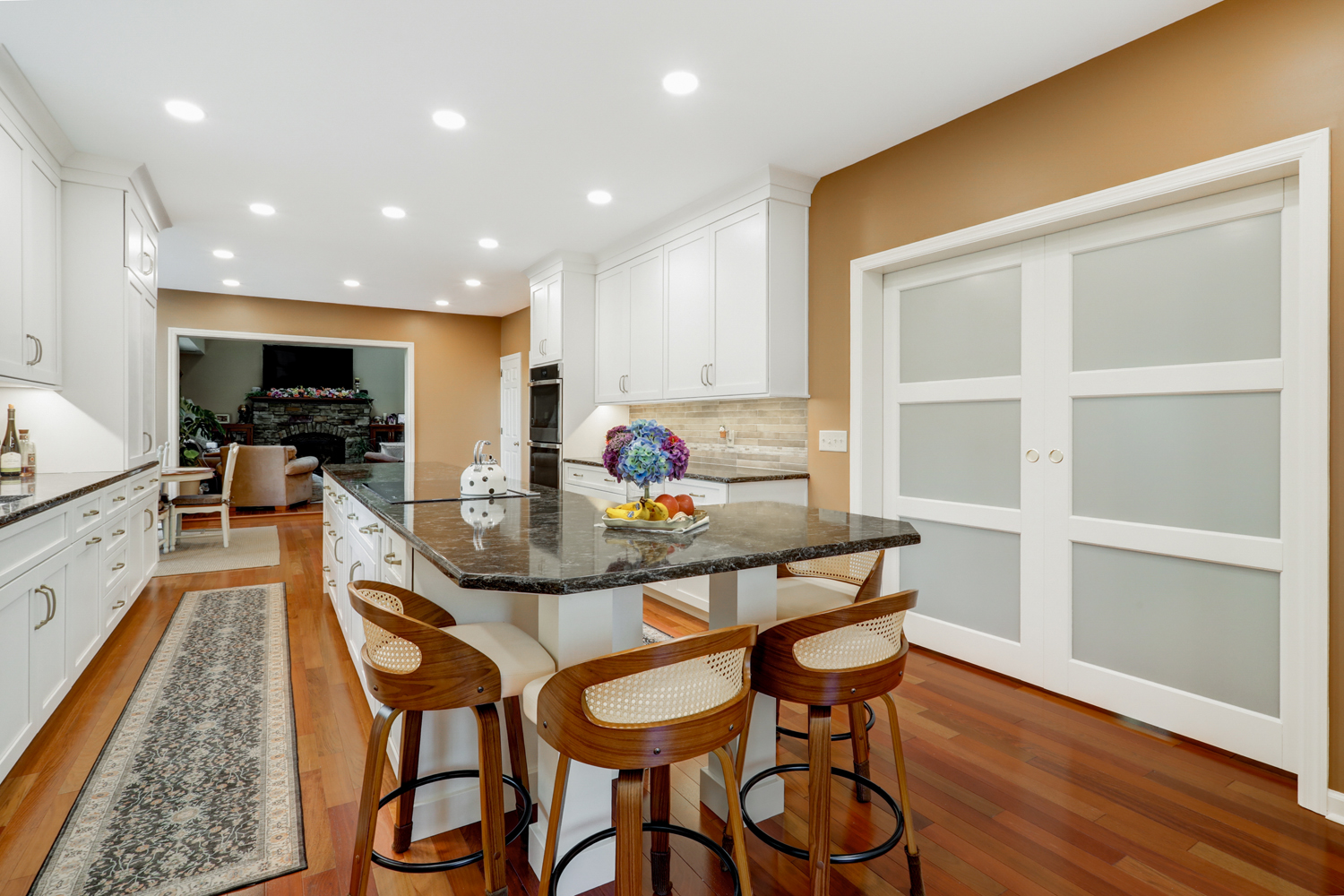 The oversized island offers ample workspace and seating, making it ideal for gathering with family or hosting guests. Topped with a rich, dark countertop, it provides contrast against the light cabinetry while delivering durability for daily use. Surrounding the island, the layout was carefully planned to maximize flow, storage, and function—key elements in any successful kitchen remodel.