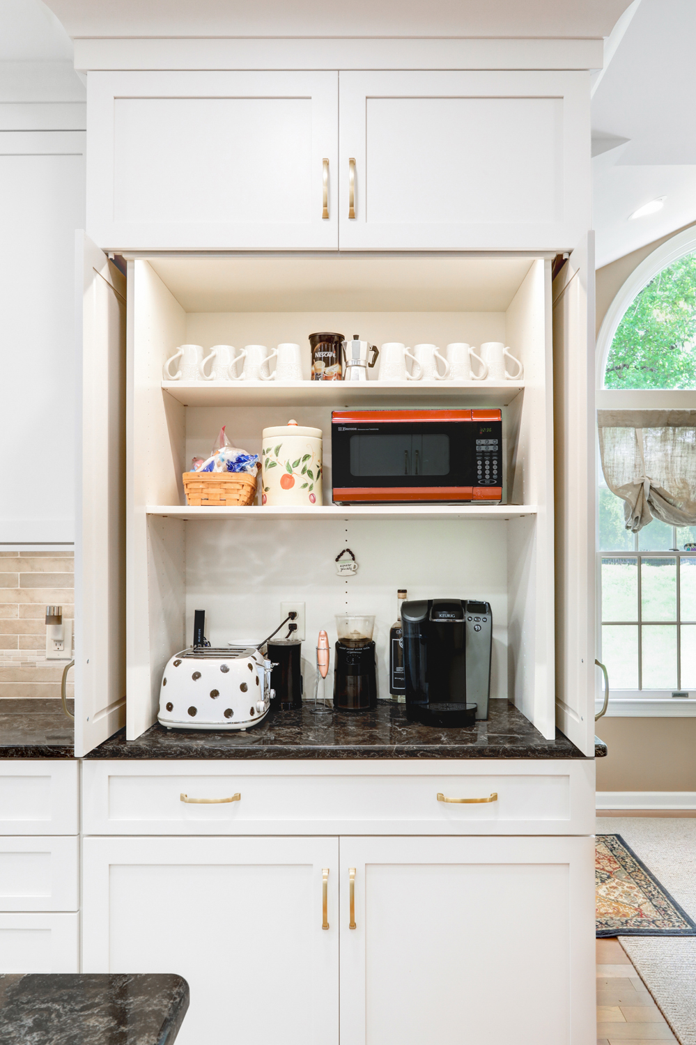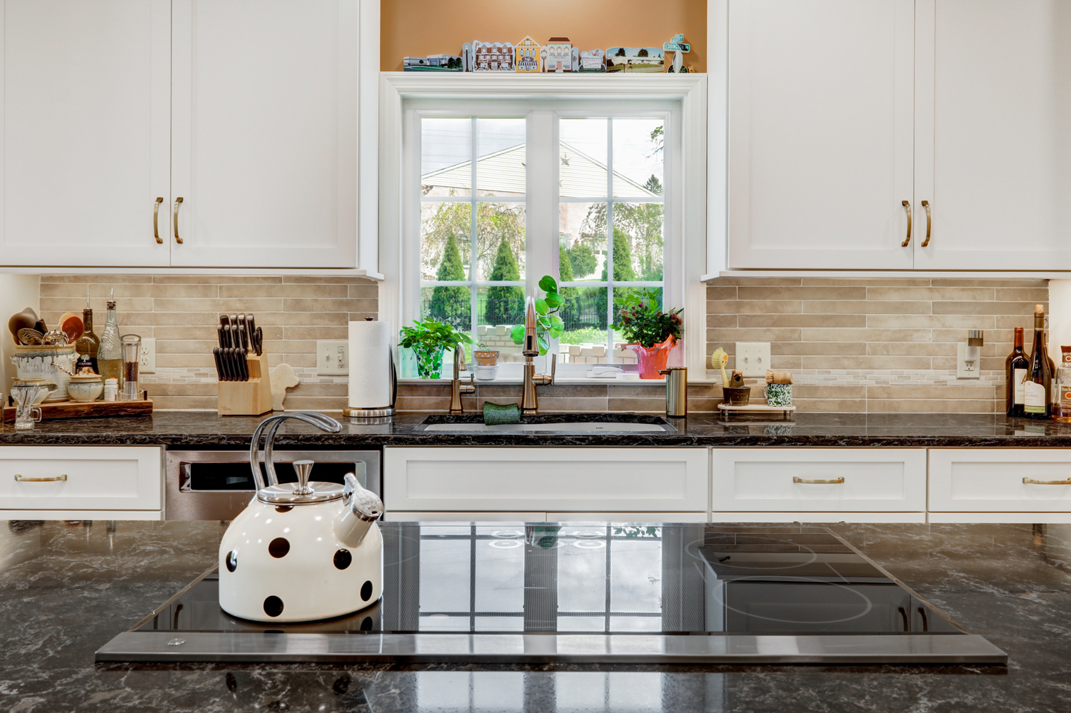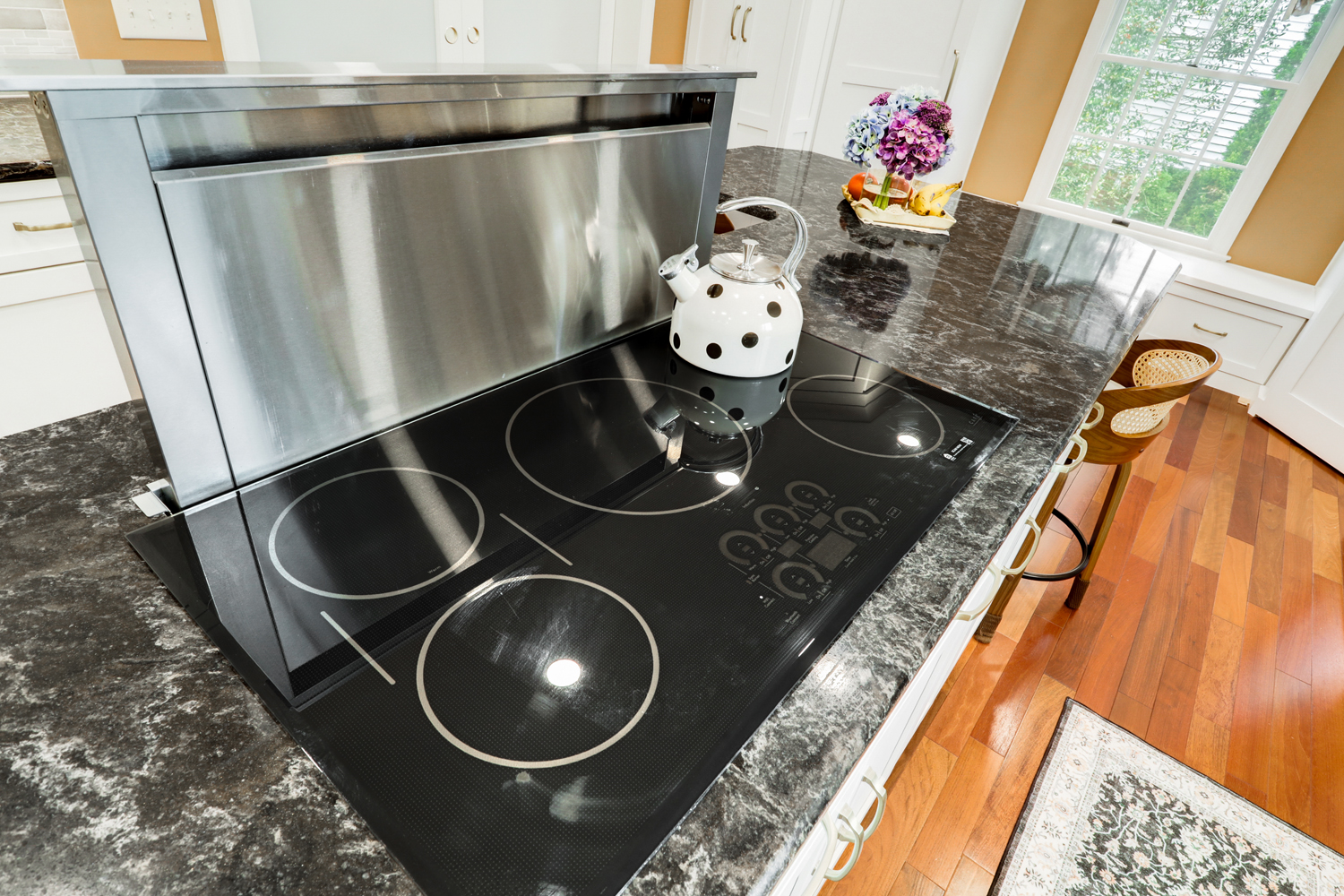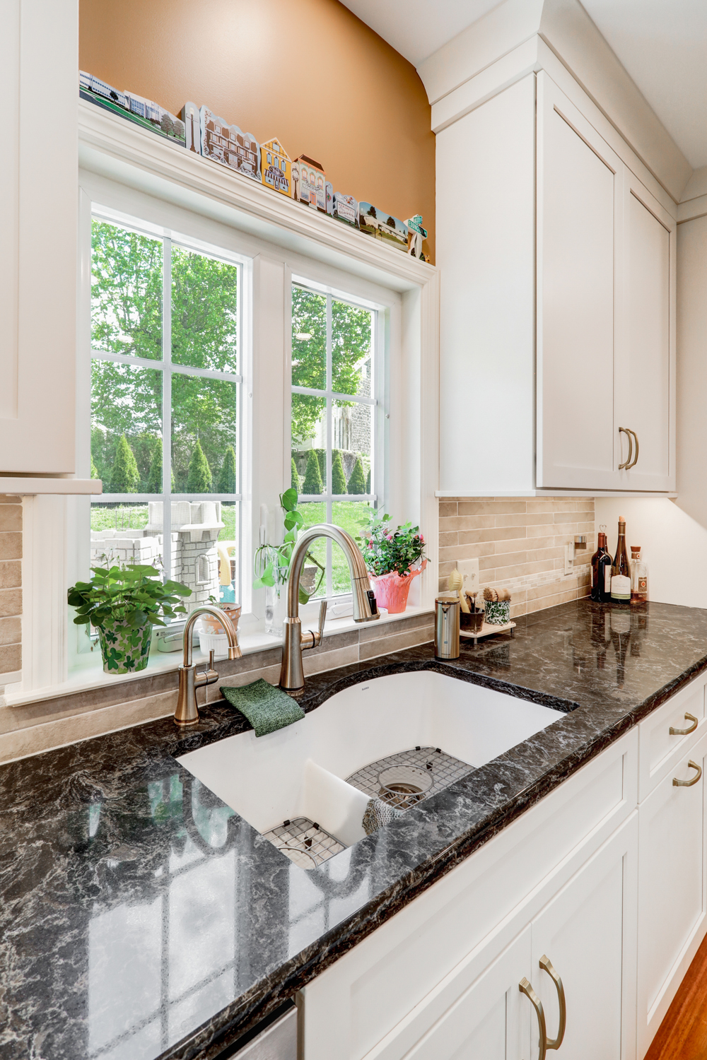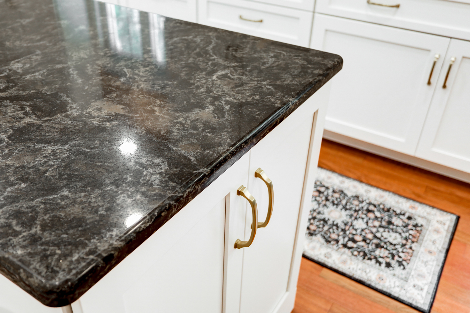 The oversized island offers ample workspace and seating, making it ideal for gathering with family or hosting guests. Topped with a rich, dark countertop, it provides contrast against the light cabinetry while delivering durability for daily use. Surrounding the island, the layout was carefully planned to maximize flow, storage, and function—key elements in any successful kitchen remodel.