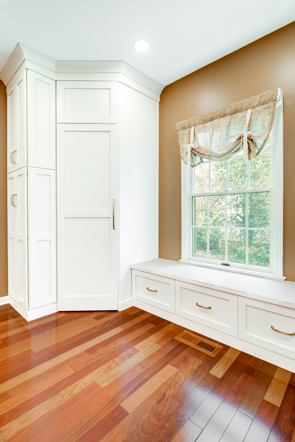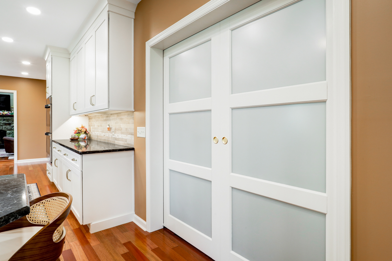 Custom cabinetry extends throughout the kitchen, offering generous storage solutions while maintaining a streamlined look. From deep drawers to built-in pantry spaces, every detail was tailored to meet the homeowner’s needs. Stainless steel appliances and a neutral backsplash tie the entire design together, creating a kitchen that feels both polished and practical.