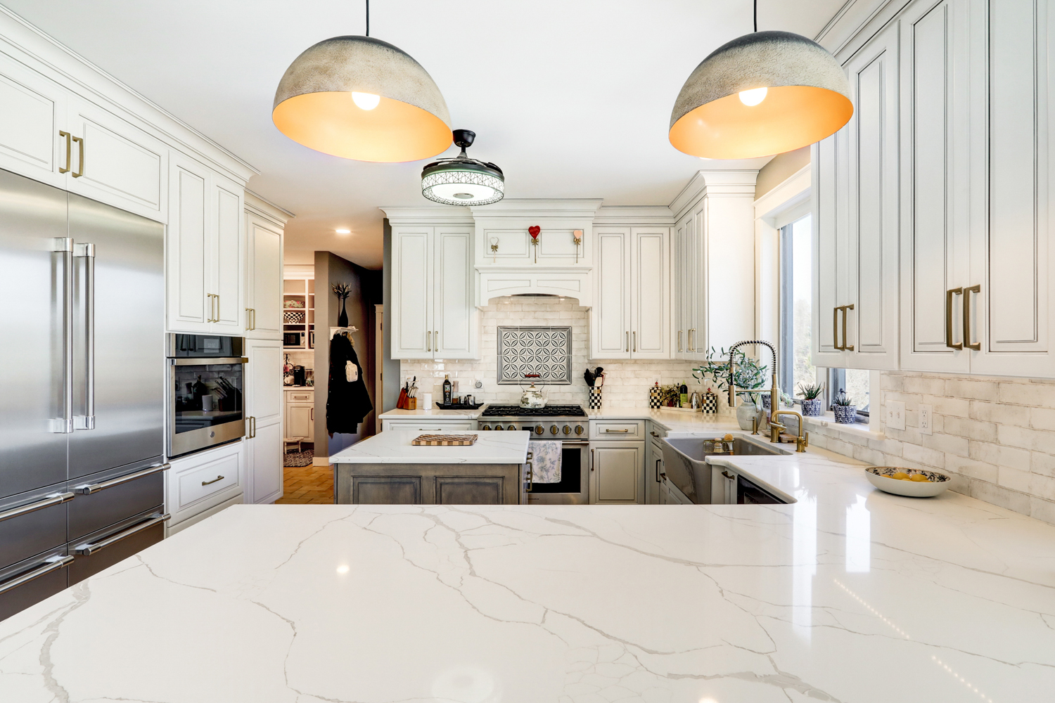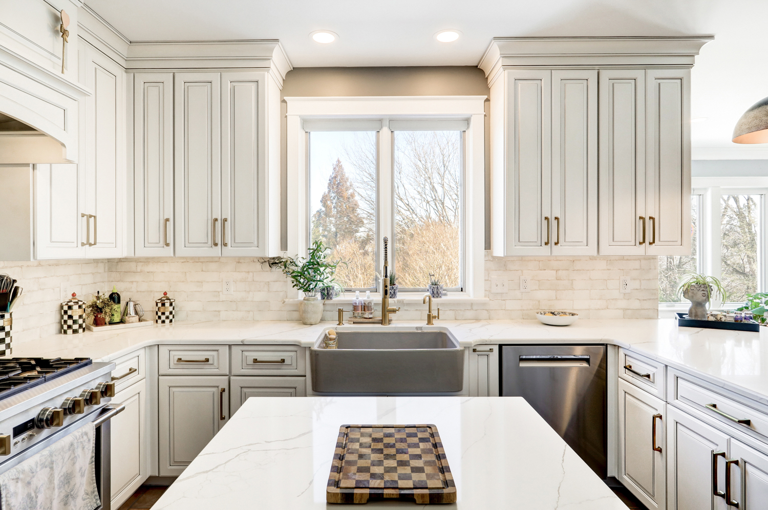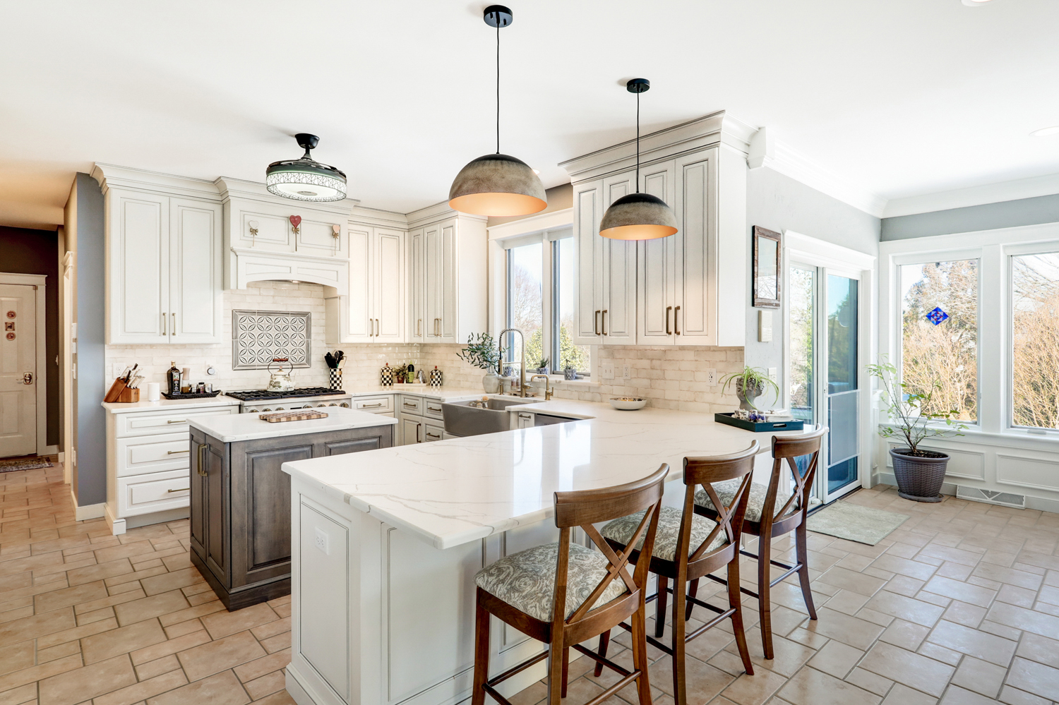 Natural light fills the room through large windows and glass doors, highlighting the clean lines of the tile backsplash and the subtle veining in the quartz surfaces. A farmhouse sink positioned beneath the window adds both charm and practicality, while layered lighting—including decorative pendants and under-cabinet lighting—creates warmth and visual interest.