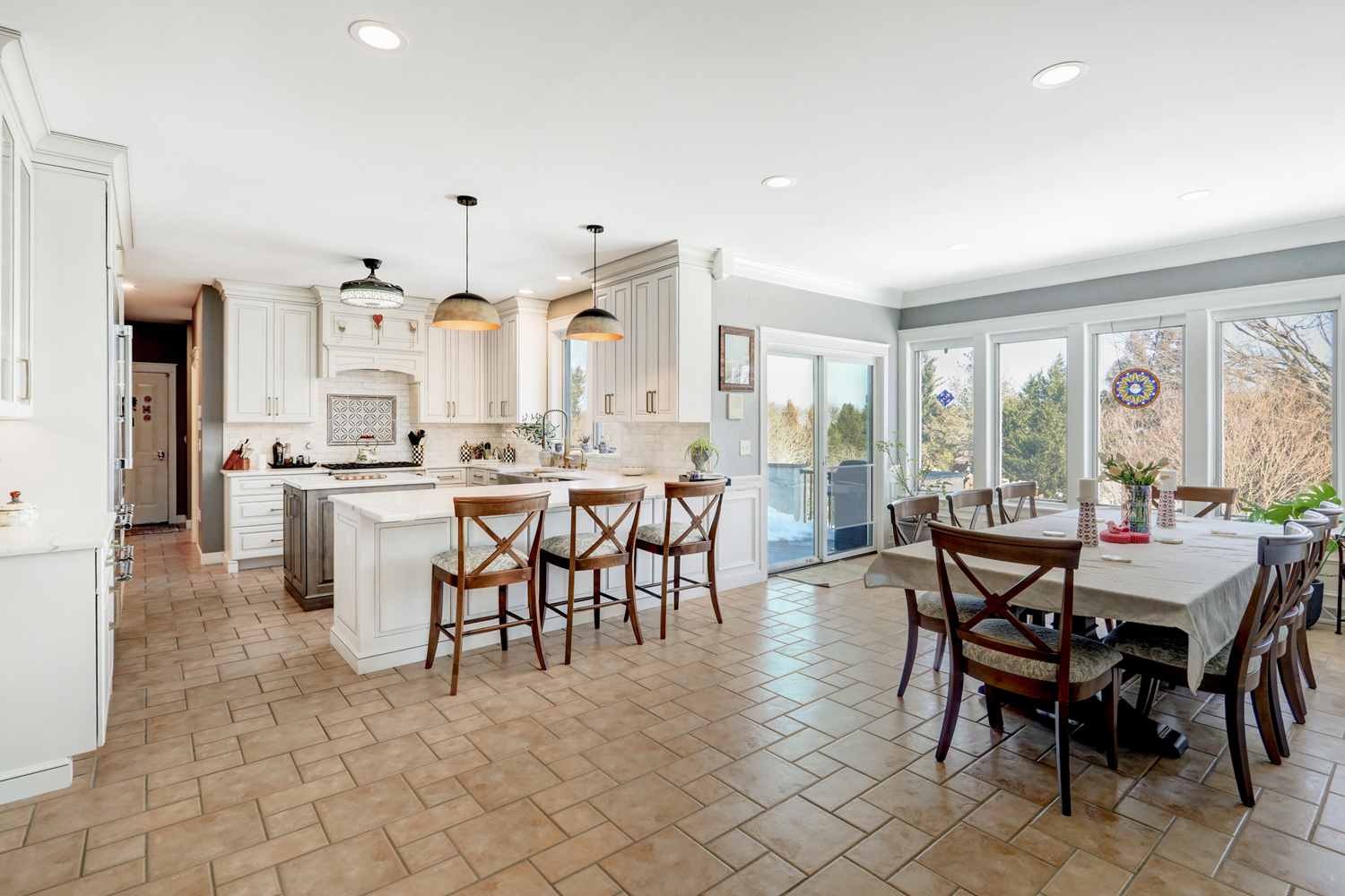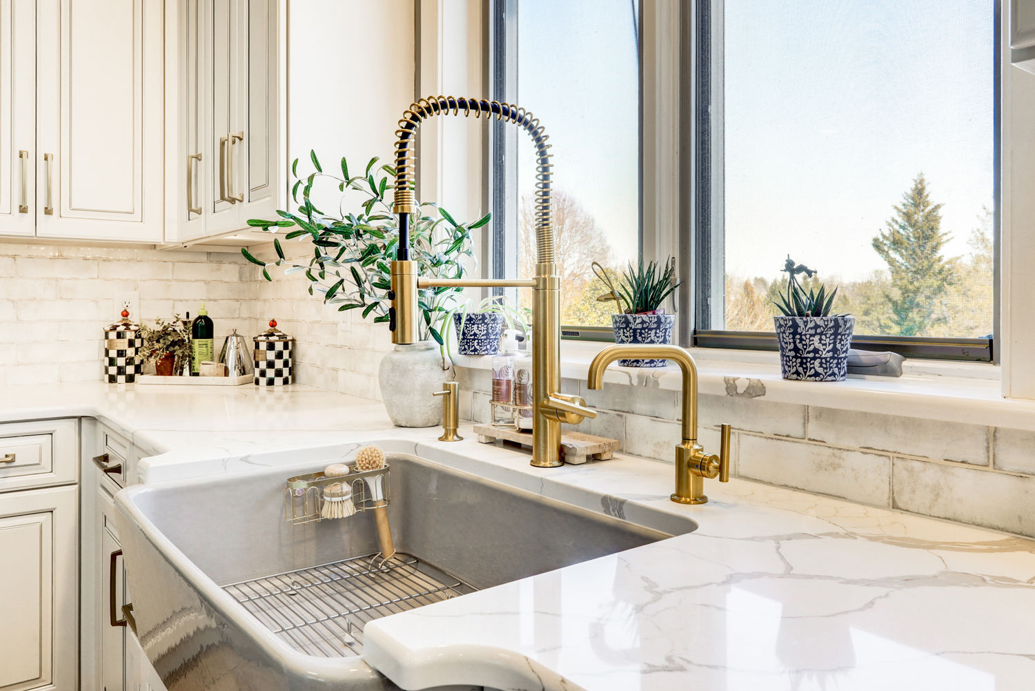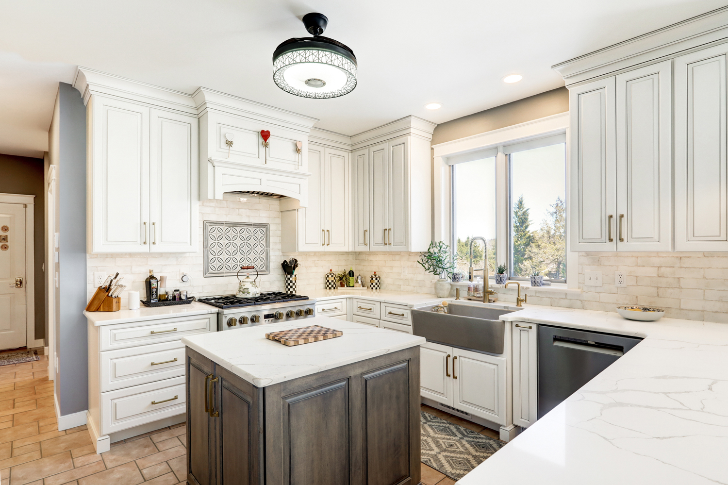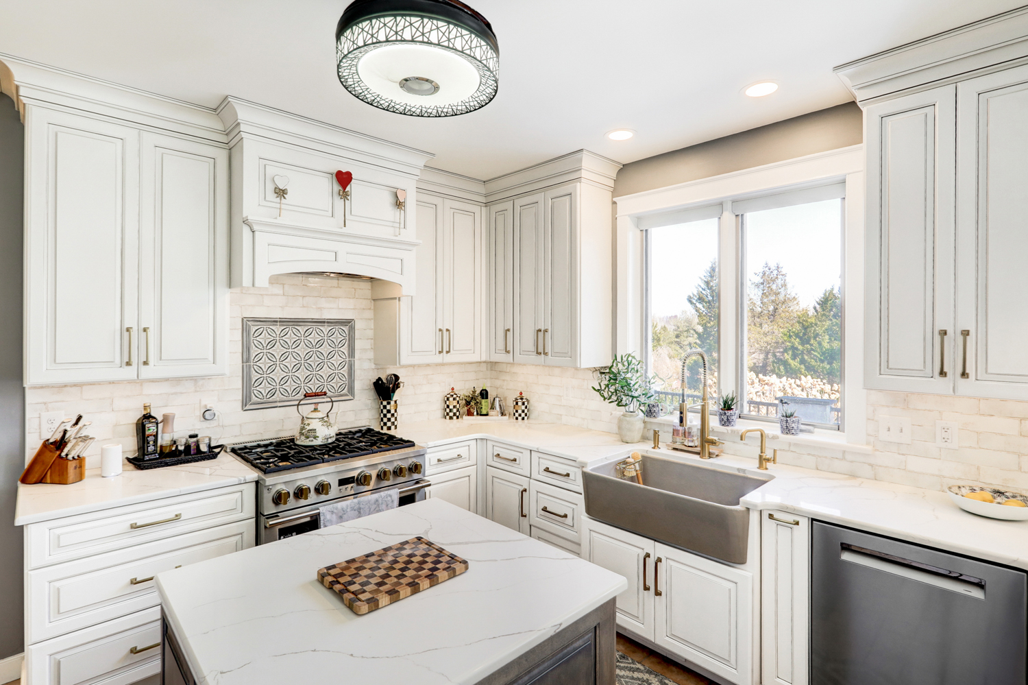 Natural light fills the room through large windows and glass doors, highlighting the clean lines of the tile backsplash and the subtle veining in the quartz surfaces. A farmhouse sink positioned beneath the window adds both charm and practicality, while layered lighting—including decorative pendants and under-cabinet lighting—creates warmth and visual interest.