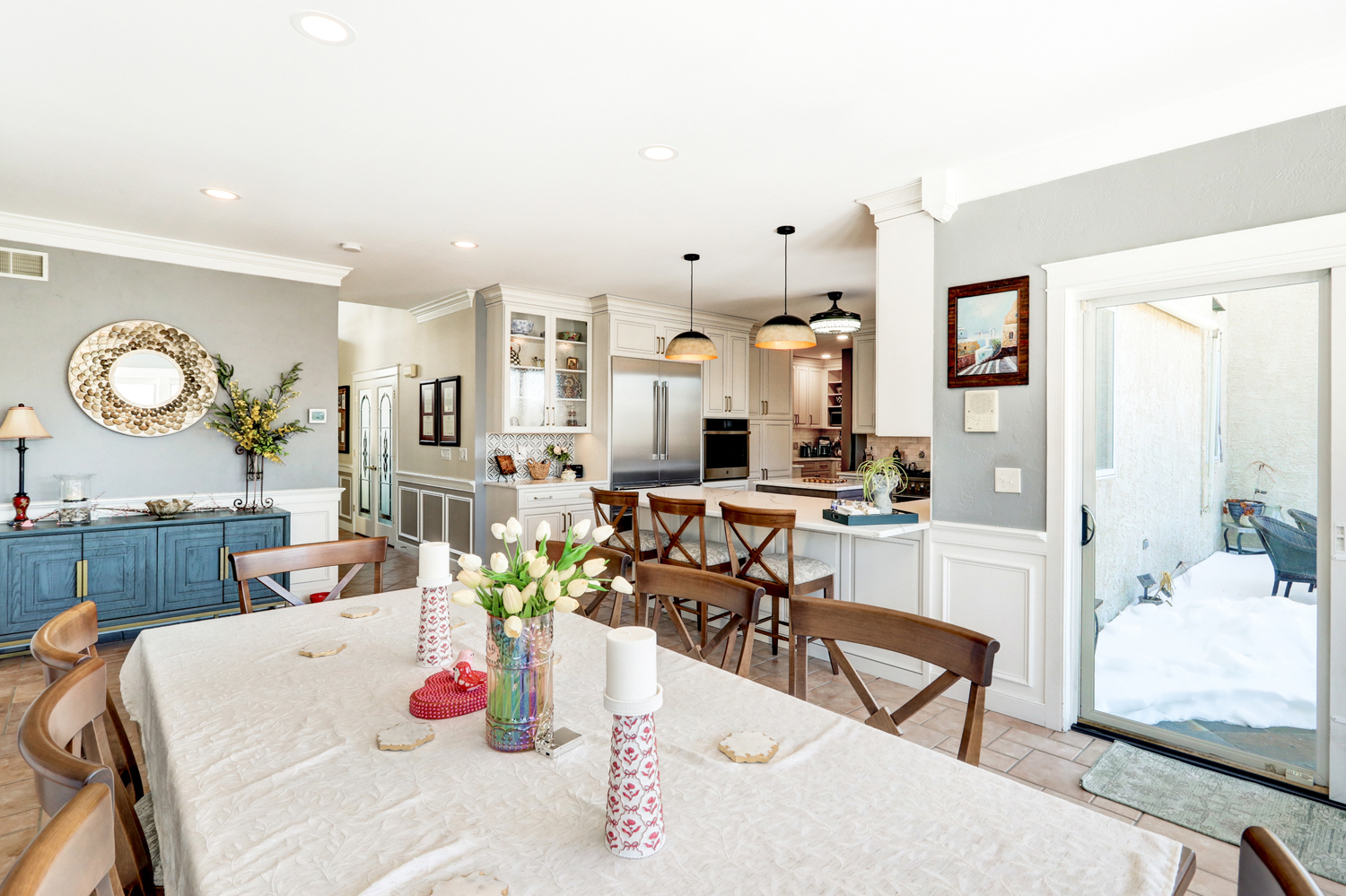 • Layered lighting with decorative pendant fixtures