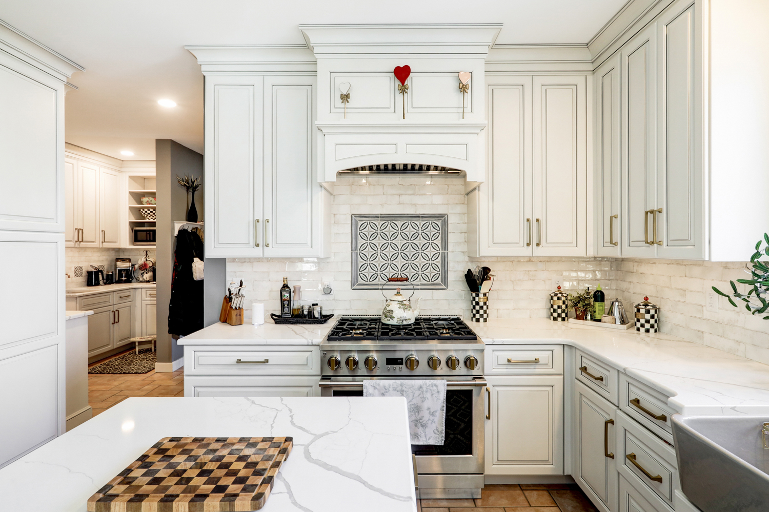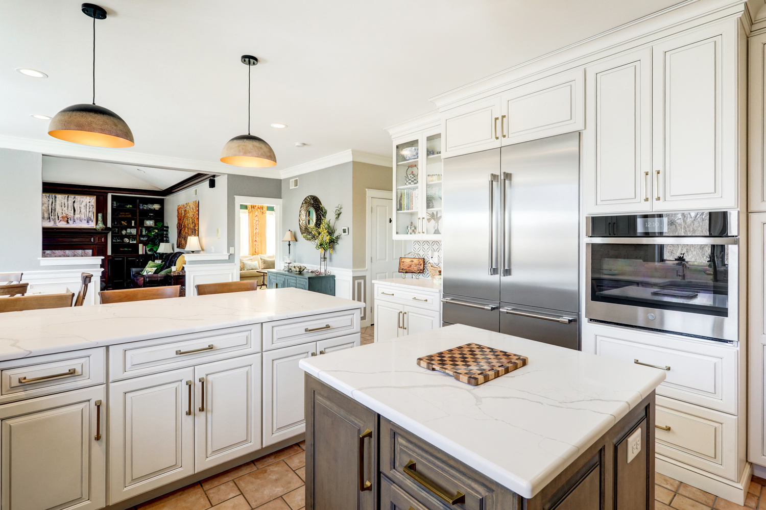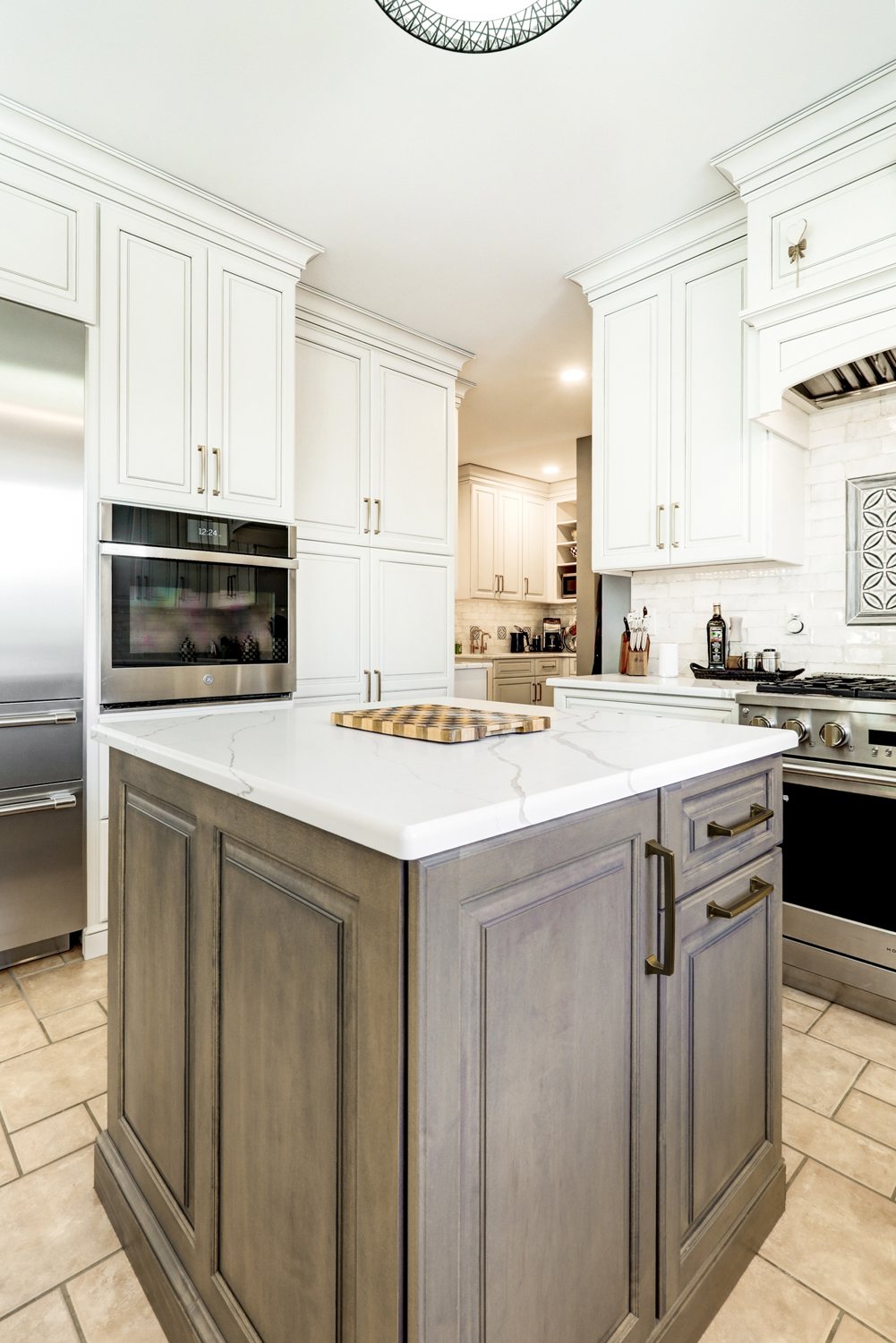 This kitchen remodel was designed to bring together timeless craftsmanship and modern functionality, creating a warm, inviting space for both everyday living and entertaining. Custom inset cabinetry from Crownwood Custom Cabinetry in a soft white finish provides a classic foundation, enhanced by crown molding details, elegant hardware, and thoughtful storage solutions throughout. At the center of the space, a spacious island with contrasting cabinetry and a quartz countertop offers additional prep space, seating, and a natural gathering point for family and guests.