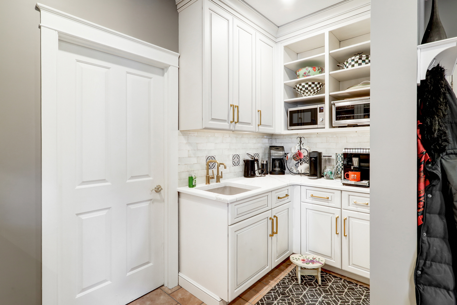 Adjacent to the main kitchen, a dedicated wet bar and coffee station provides a convenient area for beverage preparation and everyday routines. This custom feature keeps the main workspace uncluttered while adding both luxury and efficiency to the overall design.